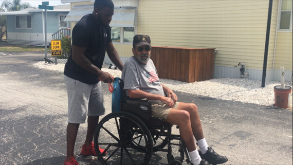รีดี้ (ซ้าย) ไปรับทหารผ่านศึกรายหนึ่งส่งโรงพยาบาลตามแพทย์นัด