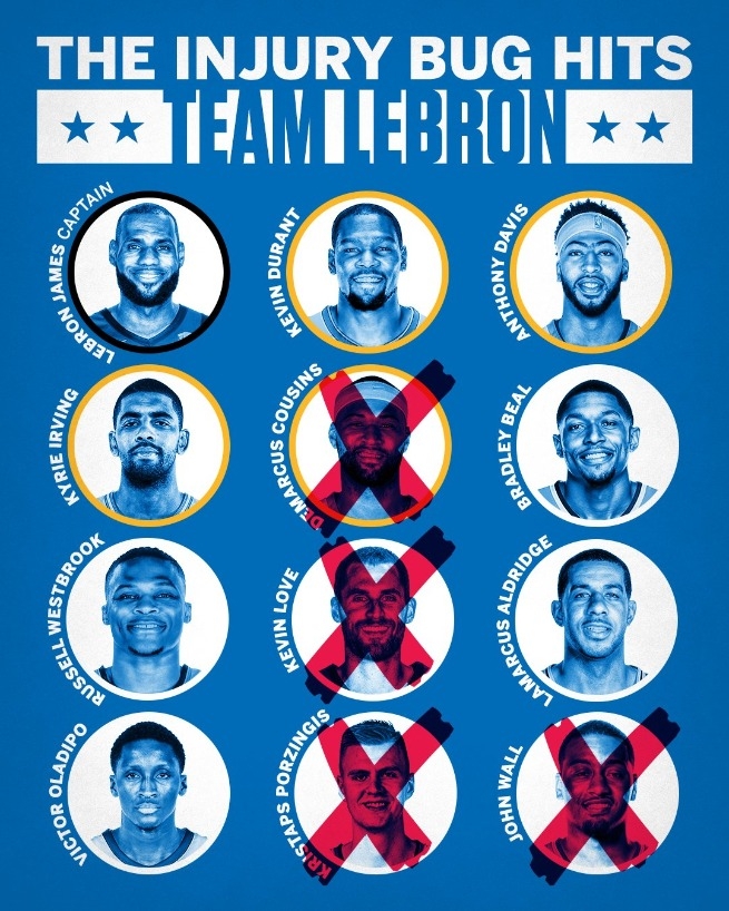 ทั้งนี้ทีมของ เจมส์ โชคร้ายมีผู้เล่นบาดเจ็บหนักถึง 4 ราย ได้แก่ เคาซิ่นส์, วอลล์, พอร์ซินกิส และ เลิฟ ซึ่งก็เรียกตัวแทนมาหมดแล้ว