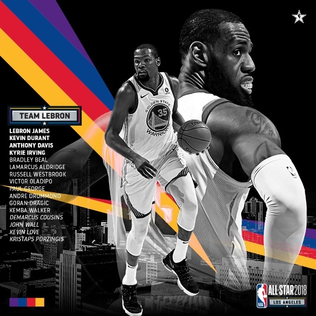 ทีมกัปตัน เลอบรอน เจมส์ (คลีฟแลนด์ คาวาเลียร์ส) : เควิน ดูแรนท์ (โกลเด้น สเตท วอร์ริเออร์ส), แอนโธนี่ เดวิส (นิว ออลีนส์ เพลิแกนส์), คายรี่ เออร์วิ่ง (บอสตัน เซลติคส์), เดอมาร์คัส เคาซิ่นส์ (นิว ออลีนส์ เพลิแกนส์)