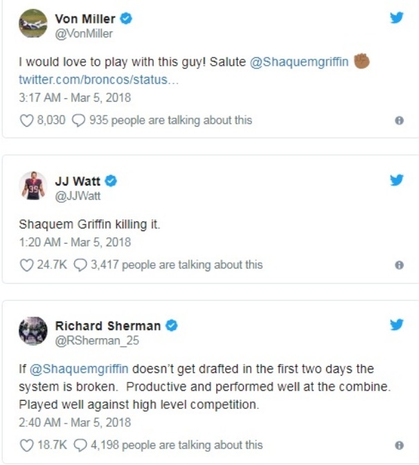 เช่นเดียวกับฟีดแบ็กของผู้เล่นดาวเด่นของลีกต่างออกมาทวีตยกย่องทั้ง วอน มิลเลอร์ กองกลางทีม เดนเวอร์ บรองโกส์ บอกว่าอยากเล่นร่วมทีมด้วย, เจ.เจ. วัตต์ ดีเฟนซีฟ เอนด์ ขาโหดสังกัด ฮิวสตัน แท็กแซนส์ ปลุกเร้า "เล่นมันเลยไอ้น้อง" หรือ ริชาร์ด เชอร์แมน ตัวคุมปีกค่าย ซีฮอว์กส์ เชียร์ให้ถูกดราฟท์ตั้งแต่สองรอบแรก