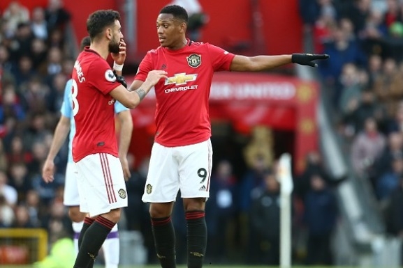 บรูโน่ แฟร์นันเดส ยกบอลจากฟรีคิกข้ามกำแพงไปให้ อ็องโตนี่ มาร์กซิยาล ซัลโวในเกมแมนเชสเตอร์ ยูไนเต็ด เอาชนะ แมนเชสเตอร์ ซิตี้ 2-0