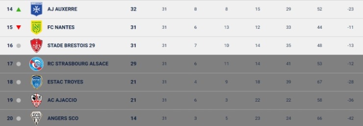 ไม่ได้เป็นการดูถูกหรือสมประมาทแต่ตอนนี้โควตาตกชั้นเป็นของ อองเช่ร์ แน่นอนแล้ว 1 ทีม ส่วนตั๋วอีก 2 จาก 3 ใบที่เหลือดูเหมือนจะเป็นของ ทรัวส์ และ อฌักซิโอ เพราะทั้งคู่ทำผลงานน่าผิดหวังมีเพียง 21 คะแนนแถมผลงานที่ผ่านมาดูเร่งไม่ขึ้นเอาเสียเลย