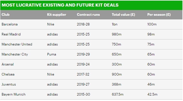 หรือจะแบรนด์อื่นอย่าง อาร์เซน่อล ที่ทำกับ อาดิดาส ( 60 ล้านปอนด์-ต่อ-ปี), แมนฯ ซิตี้ ใช้ยี่ห้อ พูม่า (65 ล้านปอนด์-ต่อ-ปี) หรือ อาดิดาส ทำกับ แมนฯ ยูไนเต็ด (75 ล้านปอนด์-ต่อ-ปี)