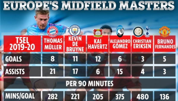 แม้สไตล์คนละแบบกับ 'เคดีบี' เห็นชัดจากสถิติผลงาน มุลเลอร์ ผ่านบอลสำเร็จ 1,207 ครั้ง/เลี้ยผ่านคู่แข่ง 31 หน เป็นรองสตาร์ แมนฯ ซิตี้ ที่ผ่านบอลสำเร็จ 1,624 ครั้ง/เลี้ยผ่านคู่แข่ง 79 หน