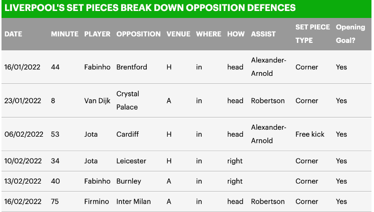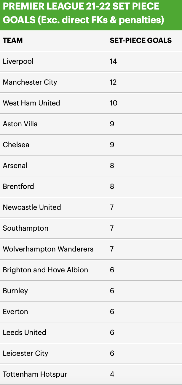 14 ประตูที่ทำได้จากเซตพีซบนลีกฤดูกาลนี้ของ ลิเวอร์พูล (ไม่รวมจุดโทษหรือฟรีคิกโดยตรง) ทำให้พวกเขายืนหนึ่งบนตารางด้านนี้