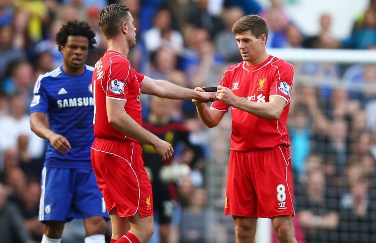 เจอร์ราร์ด (ขวา) ส่งมอบปลอกแขน ลิเวอร์พูล ให้ เฮนเดอร์สัน (ซ้าย)