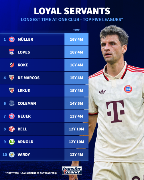 ลำดับหนึ่งร่วมเวลานี้มีด้วยกัน 3 คนที่รับใช้สังกัดเดิมมานาน 16 ปี, 4 เดือนกว่า ได้แก่ โธมัส มุลเลอร์ เสาหลักของ บาเยิร์น มิวนิค และทีมชาติเยอรมัน