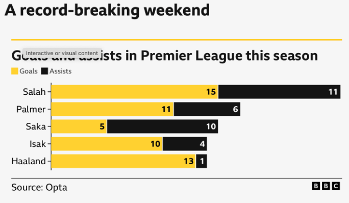 นอกจาก 15 เม็ดลุ้นรองเท้าทองคำแต่เพียงผู้เดียวแล้ว แง่จำนวนแอสซิสต์ก็มากสุดด้วย เพราะบวกเพิ่มอีกสองจาก ท็อตแน่ม ฮอตสเปอร์ สเตเดี้ยม รวมเวลานี้ 11 เปิดป้อน