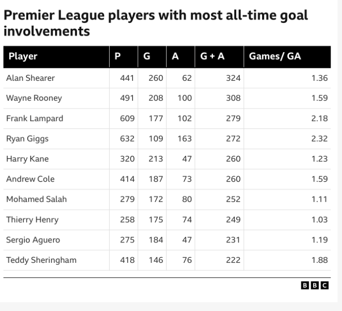 โดยสถิติลำดับหนึ่งตอนนี้เป็นของ อลัน เชียเรอร์ 324 ประตู แบบที่แข่งมากกว่า ซาลาห์ 65 เกม