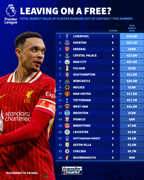 อ้างอิงจากเว็บไซต์ ‘ทรานส์เฟอร์ มาร์เก็ต’เชื่อว่าหลัง 30 มิ.ย.จะมีผู้เล่นไม่น้อยกว่า 50 คนของทีมชุดใหญ่ จากลีกสูงสุดเมืองผู้ดีที่หมดสัญญา