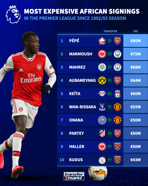 แน่นอนลำดับหนึ่งตลอดกาลยังไม่มีใครแซง นิโกล่าส์ เปเป้ ที่ย้ายจาก ลีลล์ มาร่วมงาน อาร์เซน่อล เรต 80 ล้านยูโร เมื่อปี 2019