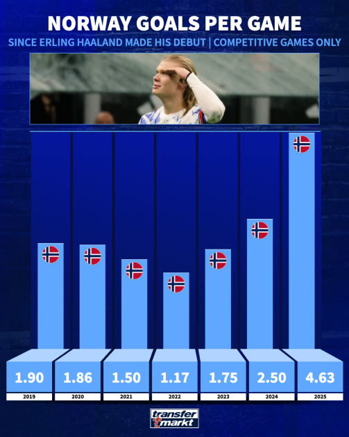 จุดระเบิดในปี 2025 นอร์เวย์ มีค่าเฉลี่ยประตูต่อเกมที่น่าทึ่งถึง 4.63 ลูก-ต่อ-เกม ซึ่งส่วนหนึ่งเป็นผลมาจากกองหน้าร่างยักษ์ของเขา