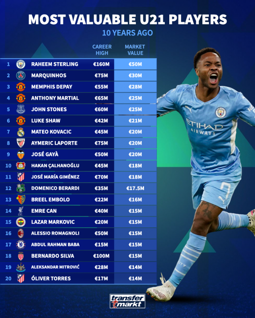 อันดับแรกคือ ราฮีม สเตอร์ลิ่ง ซึ่งได้รับการยกย่องว่าเป็นหนึ่งในผู้เล่นที่ดีที่สุดในพรีเมียร์ ลีก อังกฤษ แล้วในวัย 21 ปี ด้วยมูลค่าตลาด 50 ล้านยูโร