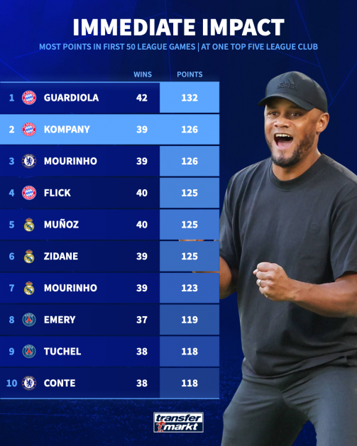 ก็องปานี อยู่อันดับสองในด้านคะแนนรวมสูงสุดจาก 50 เกมลีกแรกในสโมสรเดียว