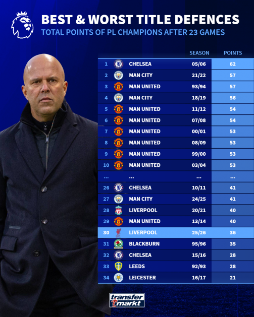 จากข้อมูลที่รวบรวมโดยเว็บไซต์ ‘ทรานส์เฟอร์มาร์เก็ต’ คะแนนที่ ลิเวอร์พูล เก็บได้หลังจากลงเล่นไป 23 นัด ทำให้พวกเขาอยู่ในกลุ่มเดียวกับทีมที่ล้มเหลวซีซั่นถัดจากเพิ่งเฮมา