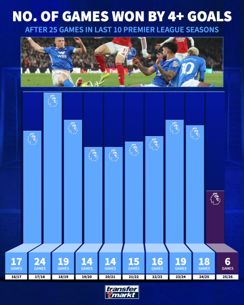 หากเราย้อนกลับไปดูประวัติการแข่งขันในฤดูกาลแรกของพรีเมียร์ ลีก อังกฤษ ในปี 1992-93 จะมีเพียงฤดูกาลเดียวเท่านั้นที่มีจำนวนเกมที่ชนะด้วยผลต่างประตู 4 ประตูขึ้นไปน้อยกว่าในฤดูกาลนี้