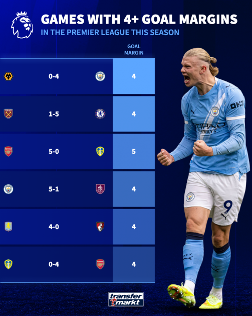 หลังจากผ่านไป 25 นัดในฤดูกาล 2023-24 มี 19 เกมที่ชนะด้วยผลต่างประตูสี่ลูกขึ้นไป