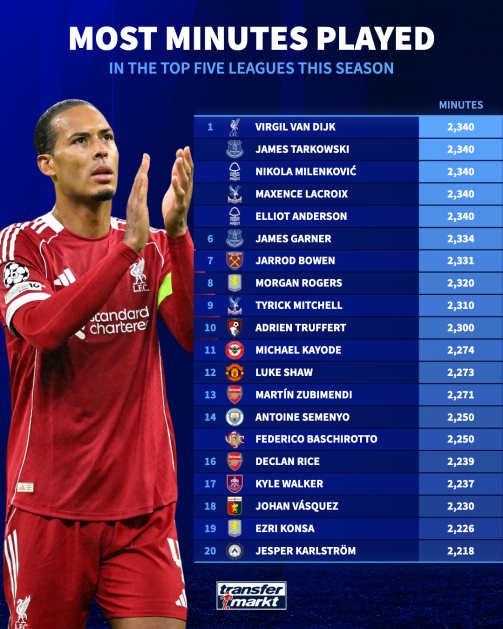 อันดับหนึ่งร่วมมี 5 คน ลงเล่นไปแล้วรวม 2,340 นาทีในฤดูกาลนี้ ได้แก่ เฟอร์จิล ฟาน ไดค์ (ลิเวอร์พูล), เจมส์ ทาร์คอฟสกี้ (เอฟเวอร์ตัน), นิโคล่า มิเลนโควิช, เอลเลียต แอนเดอร์สัน (ฟอเรสต์) และ แม็กซ็อง ลาครัวซ์ (คริสตัล พาเลซ) อันดับที่หกคือ เจมส์ การ์เนอร์ ของ เอฟเวอร์ตัน ด้วยเวลา 2,334 นาที