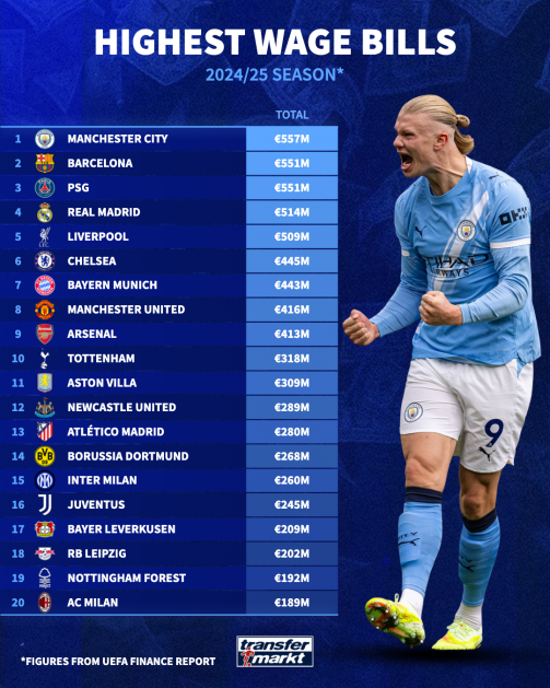 โดยเป็นเพียงสองสโมสรอื่น ๆ ที่มีค่าใช้จ่ายด้านค่าจ้างเกิน 500 ล้านยูโร