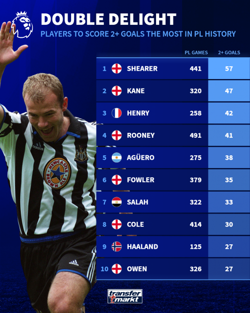 ดาวซัลโวสูงสุดตลอดกาลของลีกรายนี้ ยังครองสถิติทำสองประตูในพรีเมียร์ ลีก อังกฤษ มากที่สุด โดยทำได้ถึง 57 ครั้ง