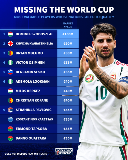 นักเตะที่มีมูลค่าสูงที่สุดในบรรดาผู้ที่พลาดโอกาสไป เวิลด์ คัพ หนนี้ คือ โดมินิก โซบอสไล ดาวเตะขอ งลิเวอร์พูล ซึ่งเป็นกัปตันทีมฮังการีในรอบคัดเลือก