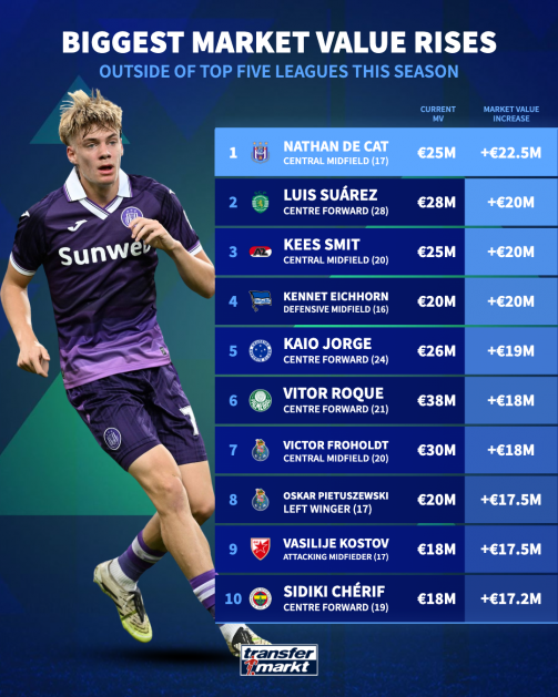 จริงอยู่รายชื่อผู้เล่นที่มีมูลค่าทางการตลาดเพิ่มขึ้นมากที่สุดในฤดูกาล 2025-26 จากเว็บไซต์ ทรานส์เฟอร์ มาร์เก็ต จะเต็มไปด้วยผู้เล่นจากลีกที่กล่าวมาข้างต้น
