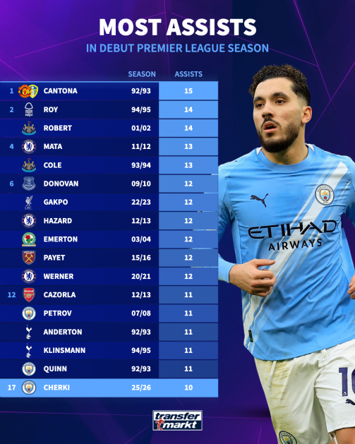 ส่วน ฆวน มาต้า และ แอนดี้ โคล ติดอันดับท็อปห้าด้วยจำนวนแอสซิสต์ 13 ครั้งเท่ากันในฤดูกาลแรกของพวกเขาในพรีเมียร์ ลีก อังกฤษ