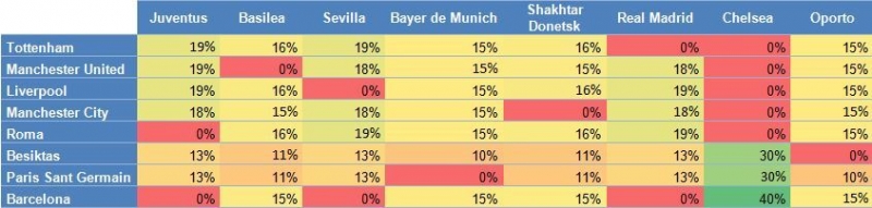 ขณะที่ เรอัล มาดริด มีโอกาสที่จะต้องลงบู๊กับทีมใดทีมหนึ่งจากเกาะอังกฤษมากกว่า เปแอสเช หรือ เบซิคตัส ซึ่งมีความเป็นไปได้ 13% แต่ แมนฯยูไนเต็ด, แมนฯซิตี้, ลิเวอร์พูล กับ โรม่า มีโอกาสพบแชมป์สองสมัยล่าสุดใกล้ในเปอร์เซนต์ที่ใกล้เคียงกัน