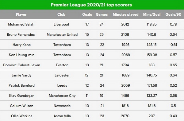 แม้ ซน ฮึง-มิน จะอยู่ในอันดับ 1 ของชาร์ตในช่วงต้นซีซั่น แต่เขาก็ยิงได้เพียง 2 ประตู จาก 9 เกมตั้งแต่เข้าสู่ปี 2021