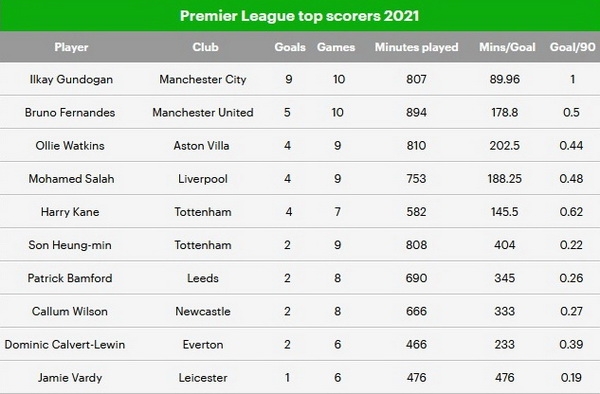 ท็อปสกอร์ของพรีเมียร์ลีก ในปี 2021