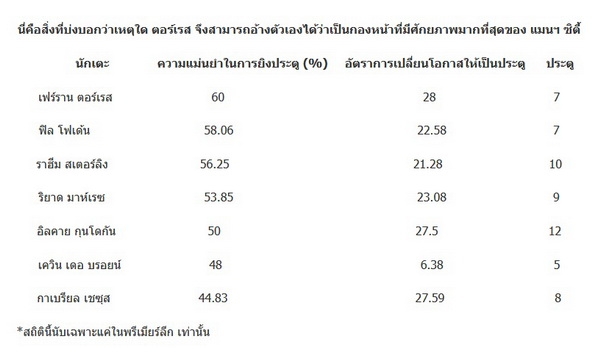 แต่ฟอร์มการทำประตูของ ตอร์เรส นั้นเข้าฝักอย่างมากในช่วงหลังๆ โดยทำไป 7 ลุก จาก 8 เกมที่ผ่านมาในระดับสโมสร และทีมชาติ ขณะที่ประตูของเขาในเกมกับ คริสตัล พาเลซ เมื่อวันที่ 1 พฤษภาคม ทำให้ กวาร์ดิโอล่า เชื่อมั่นอย่างแท้จริงว่าเขามีความสามารถที่จะเป็นกองหน้าระดับท็อปในพรีเมียร์ลีก