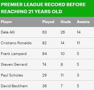 ในอายุนั้น เขาทำได้ 26 ประตู และ 14 แอสซิสต์ ในพรีเมียร์ลีก หลังผ่านไป 63 เกม นั่นทำให้เขามีสถิติดีที่สุดเหนือกว่าสุดยอดแข้งอย่าง คริสเตียโน่ โรนัลโด้, แฟร้งค์ แลมพาร์ด, สตีเว่น เจอร์ราร์ด, พอล สโคลส์ และ เดวิด เบ็คแฮม เสียอีก