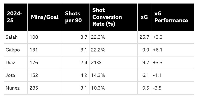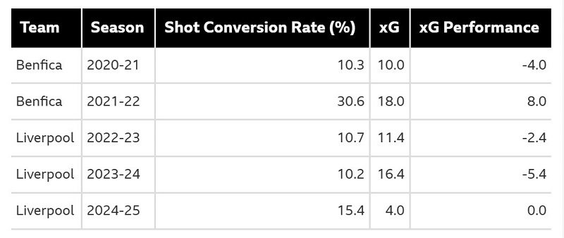 - ฤดูกาลที่แล้ว นูนเญซ ทำผลงานต่ำกว่าค่า xG ที่ 5.4 ในพรีเมียร์ลีก ซึ่งลดลงจาก 2.4xG ในซีซั่นแรกของเขา