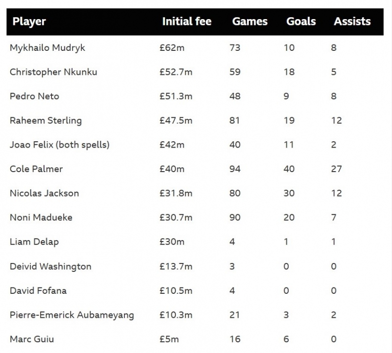 เชลซี ใช้เงินไปมากกว่า 560 ล้านปอนด์ หรือคิดเป็น 43% ของเงินที่ เชลซี จ่ายให้กับตัวรุก 18 คน โดย 13 คนในจำนวนนั้นประเดิมสนามให้กับ สิงห์บลูส์ และได้ผลตอบแทนที่ผสมปนเปกันไป