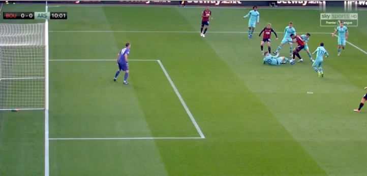 จังหวะนี้ดูค่อนข้างยากเพราะเป็นการปั๊มบอลกันของผู้เล่นทั้งสองทีม เสี้ยวของเสี้ยววินาทีที่บอลกระเด้งกระดอนนั้นไม่รู้ว่าโดนใครเป็นคนสุดท้ายก่อนไปถึง บรู๊คส์ อีกทั้งแข้งบอร์นมัธก็อยู่ในตำแหน่งต่ำกว่า ชโคดราน มุสตาฟี่ ที่เสียหลักนอนแผ่บนพื้น
