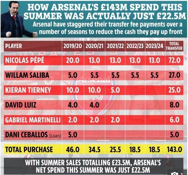 อาร์เซน่อลสามารถซื้อนักเตะมูลค่ารวมกัน 143 ล้านปอนด์มาร่วมทีมได้ด้วยการจ่ายเงินจริงๆ ในซัมเมอร์นี้ไปเพียง 46 ล้านปอนด์ ที่เหลือเป็น "เงินผ่อน" ที่ต้องชำระในเวลาอีกหลายปี