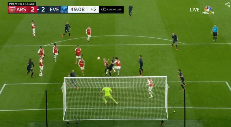 โดมินิค คัลเวิร์ต-เลวิน จึงมีเวลาได้กระโดดตีลังกาฟาดลูกบอลเข้าประตู ขณะลูกสองของ ริชาร์ลิซอน ก็ยืนรอลูกโขกเช็ดมาให้ของ เยร์รี่ มีน่า แบบโล่งๆ ไม่มีแข้งปืนอยู่ใกล้