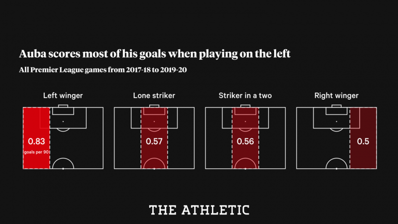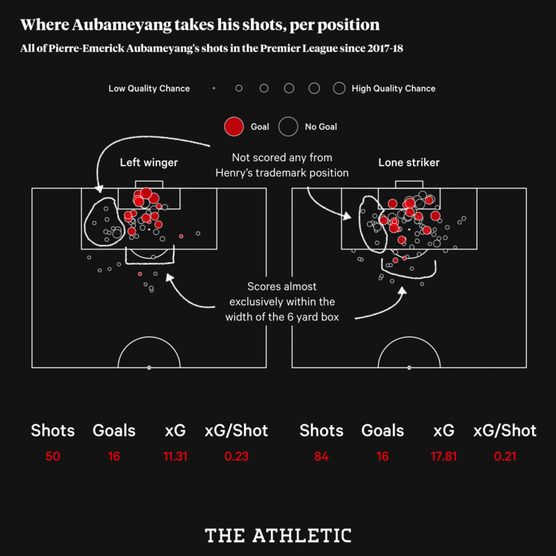 ค่าเฉลี่ยการยิงประตูของ โอบาเมย็อง ในตำแหน่งกราบซ้ายอยู่ที่ 0.83 ประตูต่อการเล่น 90 นาที