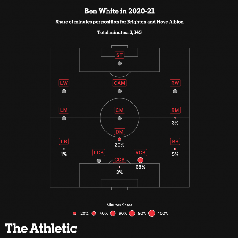ฤดูกาล 2020/21 ที่ผ่านมา เบน ไวท์ เล่นในตำแหน่งกองหลังฝั่งขวากับระบบสามกองหลังของ ไบรท์ตัน ทำให้คุ้นเคยกับการเล่นด้านข้างเวลารับมือกับตัวริมเส้นคู่แข่ง เช่นเดียวกับการคัฟเวอร์ด้านใน