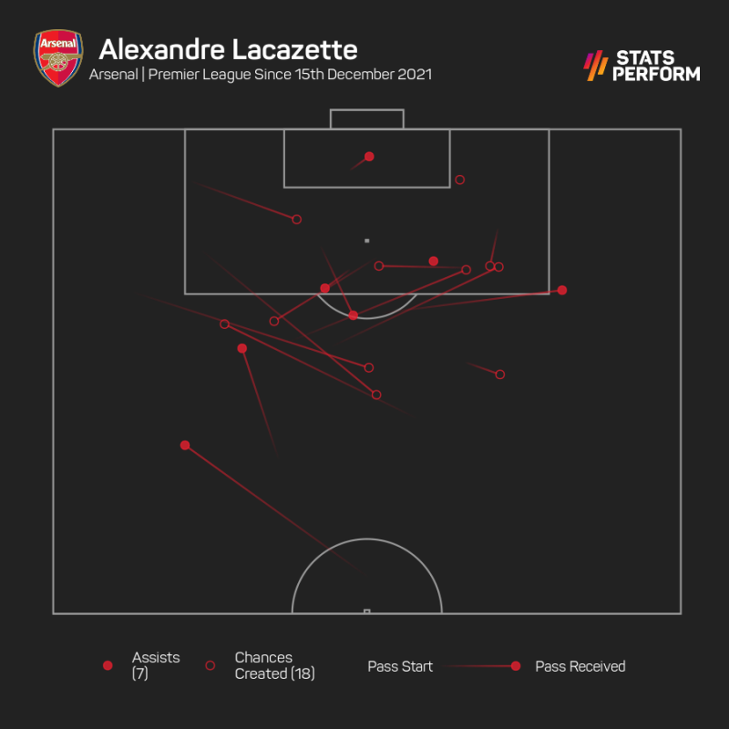 ในช่วง 10 นัดนี้ ลากาแซ็ตต์ ยิงได้เพียง 2 ประตูและหนึ่งในนั้นเป็นจุดโทษ แต่ทำได้ถึง 7 แอสซิสต์ มากกว่านักเตะพรีเมียร์ทุกคนในช่วงเวลาเดียวกัน ซึ่ง 2 แอสซิสต์ล่าสุดก็ช่วยทีมบุกชนะ วัตฟอร์ด 3-2