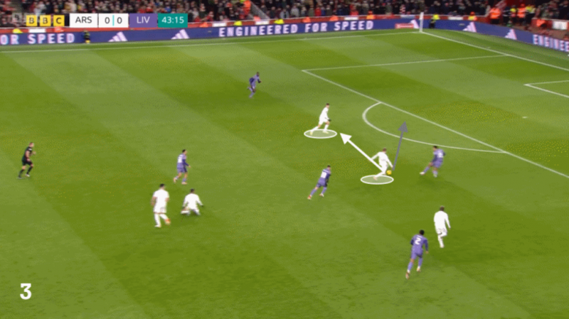 และอีกครั้งในนาที 43 ที่ จาเรลล์ ควานซาห์ ออกบอลไม่ดี รีสส์ เนลสัน จึงปาดแย่งได้ บอลมาถึง มาร์ติน โอเดการ์ด ที่ไหลให้ ไค ฮาแวร์ตซ์ ทว่าย้อนหลังไปนิดทำให้ ฮาแวร์ตซ์ ต้องเสียเวลาพาบอลเข้าไปอีกนิด และสุดท้ายยิงไม่ดีอีกตามเคย