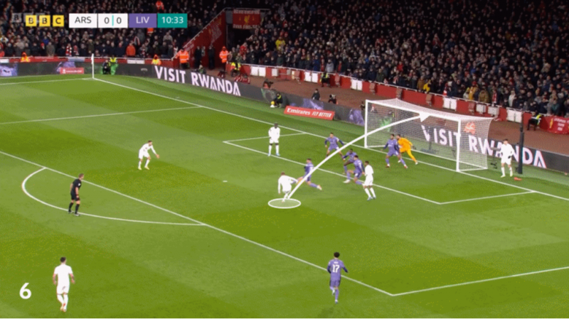 จังหวะนี้ โอเดการ์ด มีอีกทางเลือกคือจ่าย จอร์จินโญ่ ที่มุมเปิดกว้างมากกว่า แต่พอยิงเองจึงพยายามงัดให้สูงเพื่อให้หนีตัวบล็อกที่ขวางหน้าถึง 5 คนรวม อาลีสซง ผู้รักษาประตู