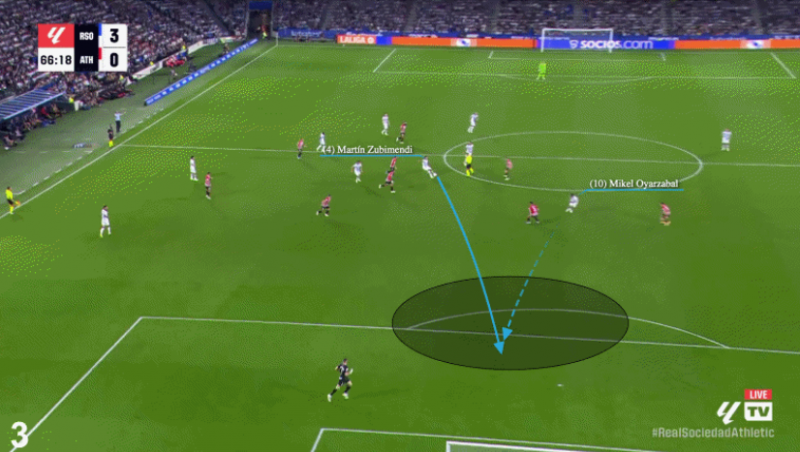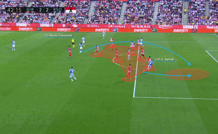อีกตัวอย่างในเกมพบ จีโรน่า ตอนนำ โซเซียดาด 2-1 และตั้งเกมรับลึกเพื่อรักษาสกอร์ก่อนพักครึ่ง ซูบีเมนดี้ ได้บอลหน้าเขตโทษ เขาเหลือบมองทันทีและเห็น อเล็กซานเดอร์ ซอร์ล็อธ ยืนอยู่เสาสอง เขาเขาชิพบอลด้วยน้ำหนักและทิศทางแม่นยำข้ามแนวรับไปให้ ซอร์ล็อธ พักอกและวอลเลย์เข้าไป