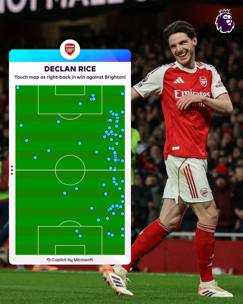 นอกจากนี้ยังมีลูกเสียบสกัดอันหนักหน่วงและแม่นยำใส่ มักซิม เดอ คุยเปอร์ ตอน ไบรท์ตัน กำลังได้โต้กลับครึ่งแรก ซึ่งเป็นการตอกย้ำความยอดเยี่ยมในการเล่นแบ็กขวาจำเป็นของ ไรซ์ ได้เป็นอย่างดี และเขาก็ได้รับเสียงโหวตจากแฟนบอล อาร์เซน่อล ให้เป็นผู้เล่นที่ดีสุดของเกมนี้