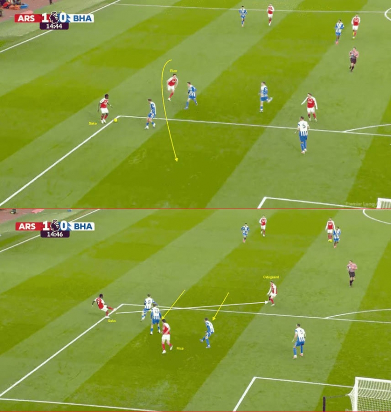 การขยับเข้ามาเล่นด้านในของดาวเตะทีมชาตินอร์เวย์ ช่วยสร้างพื้นที่ให้ ซาก้า ได้ดวลตัวต่อตัวกับวิงแบ็กของไบรท์ตันทางฝั่งขวา ไม่ได้เข้าไปยืนทับพื้นที่กัน แต่เลือกรับบอลในตำแหน่งกลางสนามและจ่ายบอลทำทางให้ปีกชาวอังกฤษได้เปรียบ