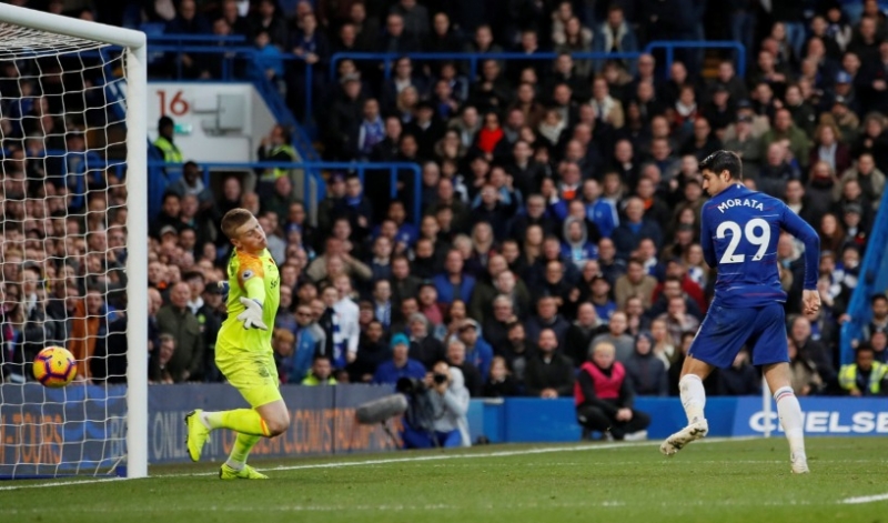 ออกสตาร์ทครึ่งหลังไม่ถึงนาที เชลซี อาศัยจังหวะที่ เอฟเวอร์ตัน ยังไม่ทันตั้งตัวเปิดเกมใส่ เอแด็น อาซาร์ เปิดบอลจากทางซ้ายมาหน้าประตู อัลบาโร่ โมราต้า ชาร์จจ่อๆแม้โดนไม่เต็มแต่บอลก็ยังเข้ากรอบ ทว่า จอร์แดน พิคฟอร์ด พุ่งสุดตัวปฎิเสธลูกยิงนี้อีก
