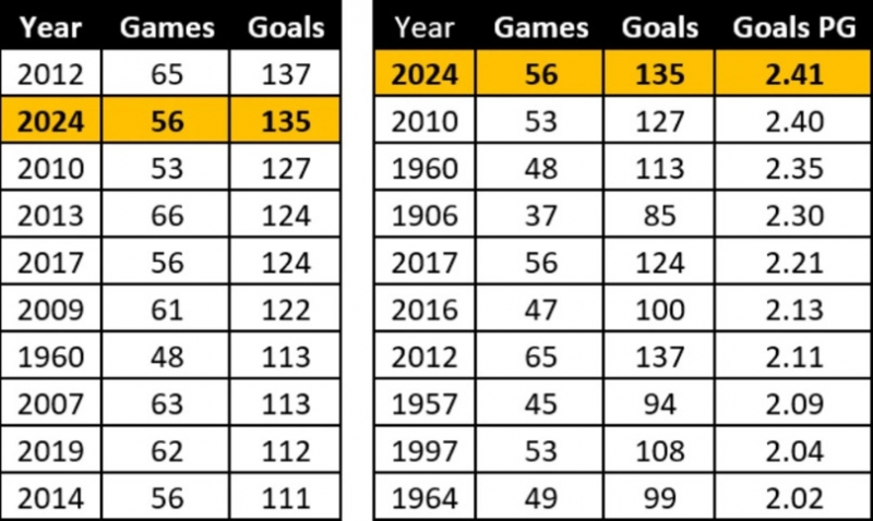และแน่นอนว่าเมื่อหารออกมาเป็นค่าเฉลี่ยแล้วนี่คือปีที่ทีมทำได้ดีที่สุด โดยมีค่าเฉลี่ยที่ 2.41 ลูกต่อเกม สูงที่สุดโดยเฉือนชนะปี 2010 ที่ทำ 127 ประตูจาก 53 เกม กับค่าเฉลี่ย 2.40 ลูกต่อเกมไปแบบหวุดหวิด