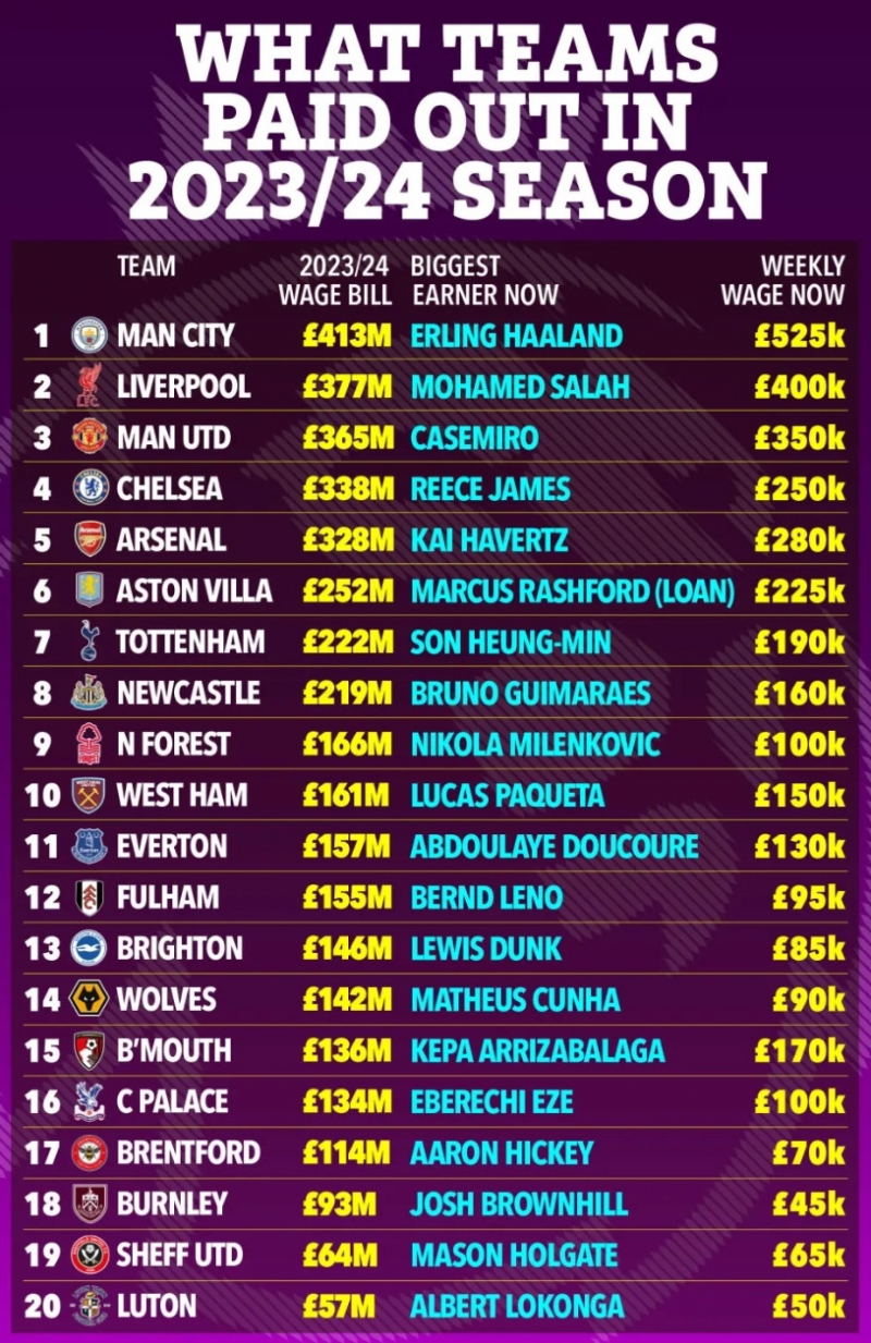 แมนเชสเตอร์ ซิตี้ คือสโมสรที่จ่ายค่าเหนื่อยสูงสุดที่ 413 ล้านปอนด์ ตามด้วย ลิเวอร์ฑูล 377 ล้านปอนด์, แมนเชสเตอร์ ยูไนเต็ด 365 ล้านปอนด์, เชลซี 338 ล้านปอนด์ และ อาร์เซน่อล 328 ล้านปอนด์