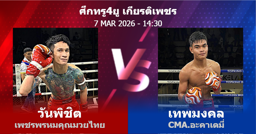 07/03/2026 14:30 ศึกมวยไทยเกียรติเพชร วันพิชิต เพชรพรหมคุณมวยไทย เทพมงคล CMA.อะคาเดมี่