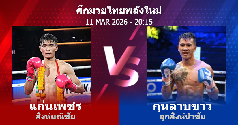 11/03/2026 20:30 ศึกมวยไทยพลังใหม่ ช่วงที่ 2 แก่นเพชร สิงห์มณีชัย กุหลาบขาว ลูกสิงห์นำชัย